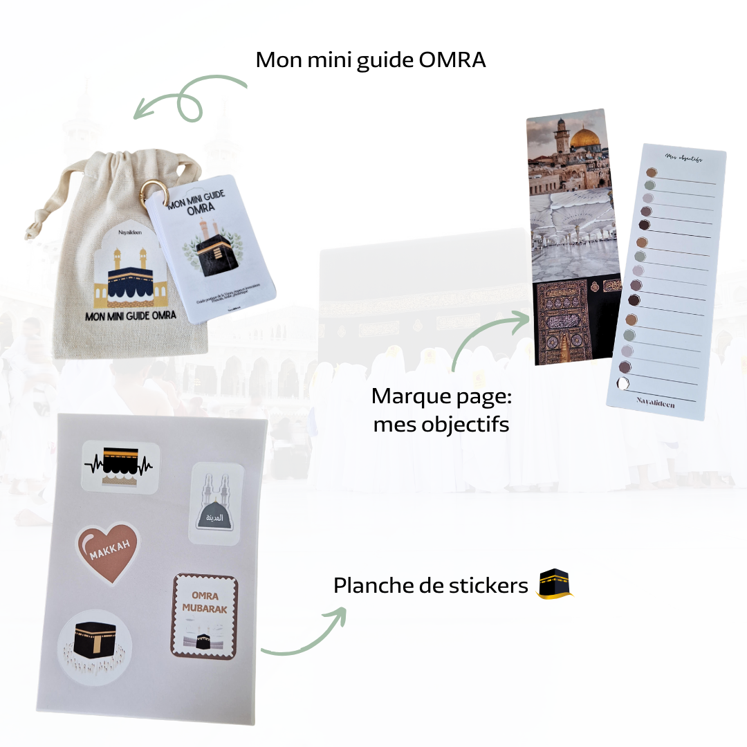 Mini guide Omra : le guide de la omra, incluant 16 pages, étapes par étape détaillée pour accomplir la Omra de manière facilité.