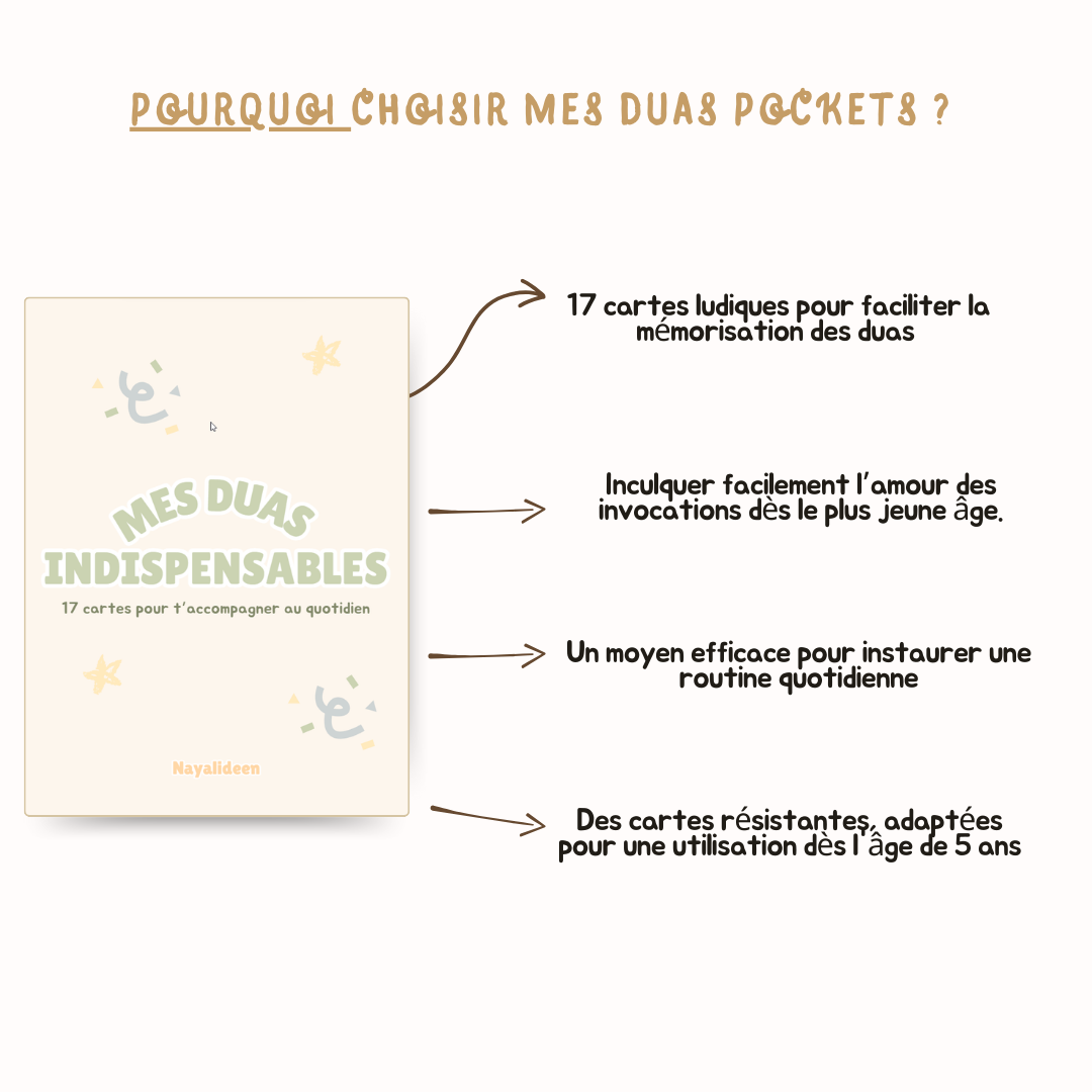 Ces cartes ludiques et pédagogiques sont conçues pour enseigner aux enfants les invocations quotidiennes islamiques (dua islamique).