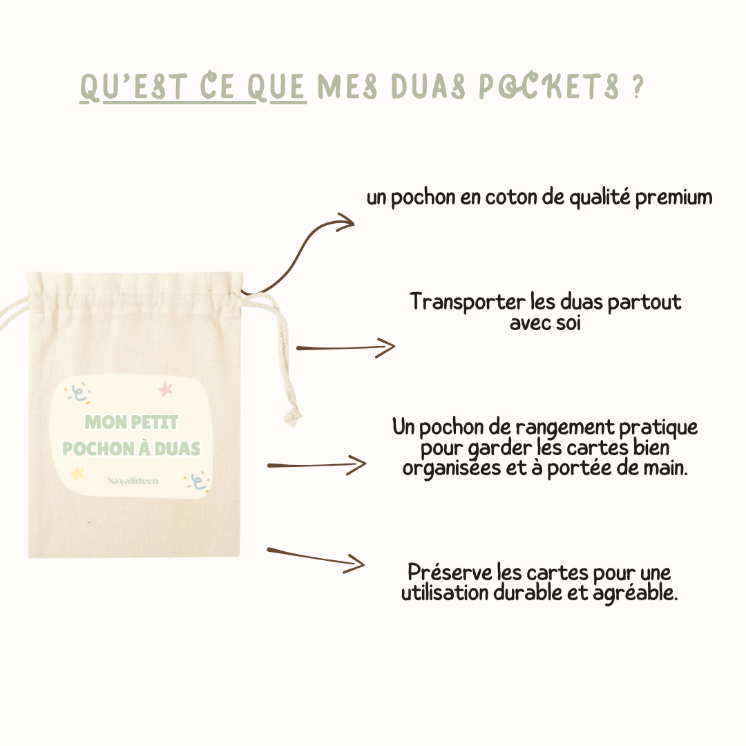 Découvrez nos 17 cartes d’invocations islamiques pour enfants, traduites en français, arabe et phonétique ainsi que son pochon en coton de qualité supérieur.